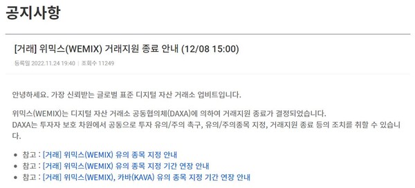 업비트·빗썸·코인원·코빗·고팍스가 포함된 디지털자산 거래소협의체(DAXA)는 위메이드 자체 발행 코인 위믹스에 대한 거래 지원을 종료를 공지했다. 거래 종료 일시는 오는 12월 8일 오후 3시부터다.