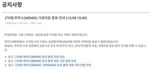 업비트 등 국내 주요 거래소는 지난 24일 오후 8시경 투자 유의 종목으로 지정된 위믹스의 거래 지원 종료를 공지했다. 업비트, 빗썸을 포함한 국내 5대 가상화폐 거래소로 구성된 디지털자산거래소 공동협의체 '닥사(DAXA)'의 결정에 따랐다고 명시했다.