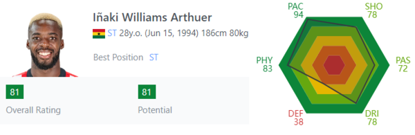 이중국적으로 가나 대표팀에 합류한 이냐키 윌리엄스는 가나의 새로운 공격 카드로 급부상했다. 발이 워낙 빨라 수비 라인을 돌파하는데 능하다. 피파23에서도 속도 능력치가 인상적이다. 가속력 92, 질주 속도 93으로 월드 클래스 수준이다. 손흥민의 가속력(88), 질주 속도(91)보다도 한 수 위니 얼마나 빠른 선수인지 알 수 있다.
