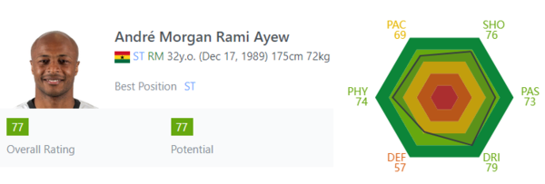가나 축구 역사상 최다 A매치 출전 기록을 보유한 상징적 존재다. 득점은 24골로 역대 6위다. 한국 팬 입장에선 2015~2016시즌 스완지 시티에서 기성용 동료로 익숙하다. 안드레 아이유 특징은 다양한 포지션을 소화할 수 있다는 것이다. 중앙 공격수, 윙 포워드, 공격형 미드필더 등 어느 포지션에 배치해도 좋은 활약을 보여줬다.
