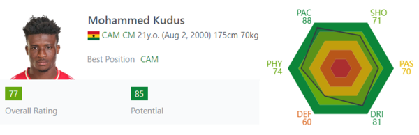 피파23에서도 볼 컨트롤(80)과 드리블 능력치(80)가 돋보인다. 움직임 관련 능력치는 무려 85.6이다. 능력치로만 분석했을 경우 한국 수비진 중에 1대1로 모하메드 쿠두스를 막을 수 있는 선수는 없다. 2019년 데뷔 당시 64였던 능력치가 어느새 77까지 상승했다. 그의 성장력이 얼마나 뛰어난 지 알 수 있는 대목이다.