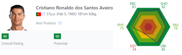 전성기보다 기량이 떨어졌지만 탄력과 스피드 그리고 드리블 실력은 여전히 월드 클래스다. 피파 게임에서 흔히 인간계 최상위 선수들의 능력치는 89로 정해진다. 모하메드 살라, 손흥민, 루카 모드리치 등 대부분 선수들이 89에 포진되어 있다. 호날두 능력치는 90이다. 그가 얼마나 대단한 선수인지 알 수 있다.