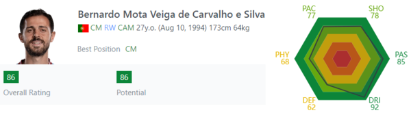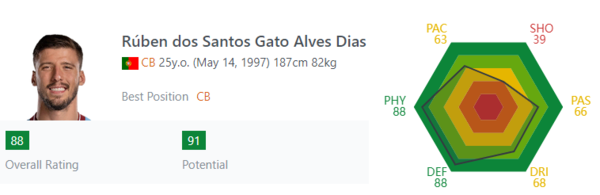후벵 디아스 능력치는 2018년 기준 76이었다. 당시에는 특별하게 잘한다는 느낌은 없었다. 하지만 맨체스터 시티 이적 이후 그의 퍼포먼스는 크게 달라졌다. 능력치가 무려 12나 상승했다. 이제는 포르투갈 수비를 책임지는 월드 클래스 선수다.