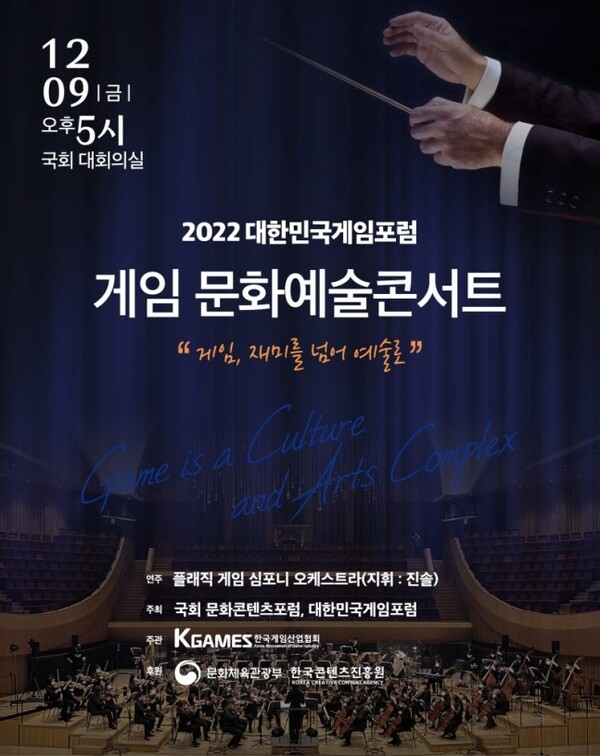 대한민국게임포럼과 국회의원 연구단체 ‘국회 문화콘텐츠포럼(대표의원 조승래, 연구책임의원 장경태)’이 공동주최하고 한국게임산업협회가 주관하는 ‘2022 대한민국게임포럼 게임 문화예술 콘서트’가 오는 9일 국회 의원회관 대회의실에서 열린다.