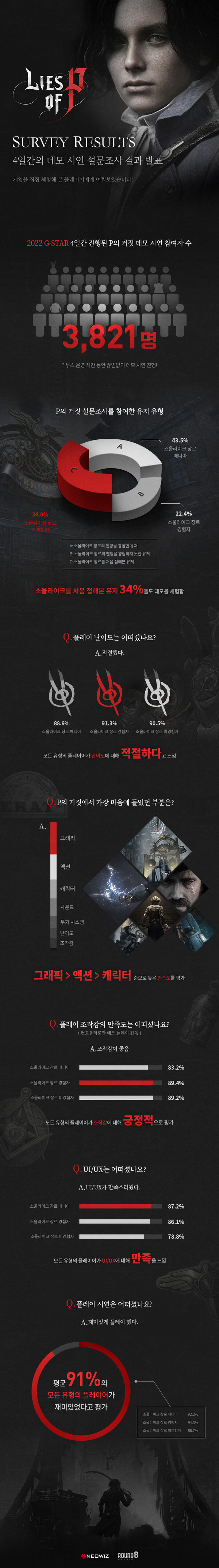 인포그래픽은 지스타 2022에서 ‘P의 거짓’ 데모 시연에 참여한 이용자 대상의 설문조사를 바탕으로 제작했다. 네오위즈에 따르면 지난 11월 17일부터 20일까지 4일간 총 3821명의 참가자들이 게임을 시연했고, 918명이 설문조사에 참여했다.