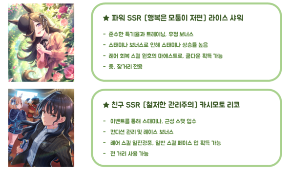 SSR 라이스 샤워와 SSR 카시모토 리코는 아오하루배 시나리오 링크 서포트 카드입니다. 아오하루배 시나리오에서 친구 카드나 시나리오 링크 캐릭터를 사용하면 초기 팀원을 줄일 수 있습니다.