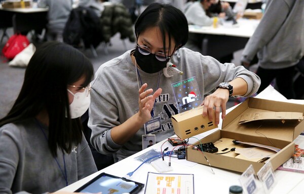 ‘코딩 무드등 만들기’는 학생들이 엔씨 임직원과 1대1로 매칭되어 기본적인 개발 교육을 받는 활동이다. 학생들은 알고리즘에 대한 이해를 바탕으로, 코딩을 통해 색상과 밝기를 조절하며 커스텀 아크릴 무드등을 제작했다.