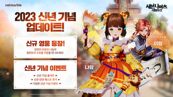 2023 신년맞이 출석 이벤트도 실시한다. 이용자들은 출석 일수에 따라 다양한 보상을 얻을 수 있으며, 이벤트 기간 동안 출석 및 플레이를 통해 신규 영웅 ‘창천도의 수호룡 이랑’을 4장까지 획득할 수 있다.