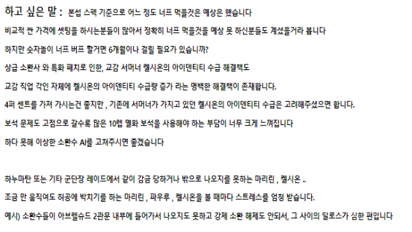 "복잡해진 딜링 구조, 이전보다 약화된 피해량, 주력 스킬 경직 면역 부재, 마나 감당 문제 개선 필요"