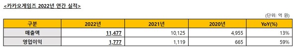 카카오게임즈는 2022년 실적이 매출 최상위를 유지 중인 ‘오딘: 발할라 라이징’ 등 기존 게임에 ‘우마무스메 프리티 더비’ 등 신작 게임의 견고한 실적이 더해져 안정적인 성과를 이어나갔다고 설명했다. 아울러 카카오 VX, 세나테크놀로지 등 비게임부문의 기타 매출의 성장이 더해졌다고 덧붙였다.