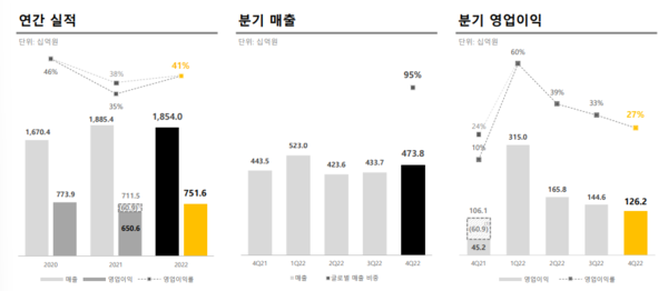 2022년 4분기 매출은 4738억 원, 영업이익 1262억 원으로 집계됐다. 전년동기 대비 7%, 영업이익이 179% 증가했다. 전분기 대비로는 매출이 9% 늘고 영업이익은 12% 감소했다. 당기순손실 1654억 원을 기록하여 적자전환했다.
