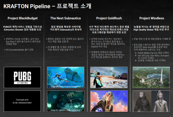 '프로젝트 블랙버짓’은 펍지 핵심 개발진이 제작 중인 오픈월드 슈팅게임이다. 탐험과 루팅, PvP, PvE를 통한 새로운 재미를 제공하는 것이 목표다. 다음으로 ‘프로젝트 골드러쉬’는 PvP, PvE 샌드박스 기반의 픽업 앤 플레이 액션 게임이다. 시즌제로 운영될 예정이다.