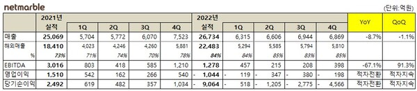 2022년 연간으로는 매출 2조 6734억원을 기록했으며, 누적 상각전 영업이익 1278억원, 누적 영업손실은 1044억원으로 집계됐다. 해외 매출은 4분기는 5810억원이며 연간 누적으로는 2조 2483억원을 차지, 연간 해외 매출 비중은 84%로, 지난해보다 11%P 증가했다.