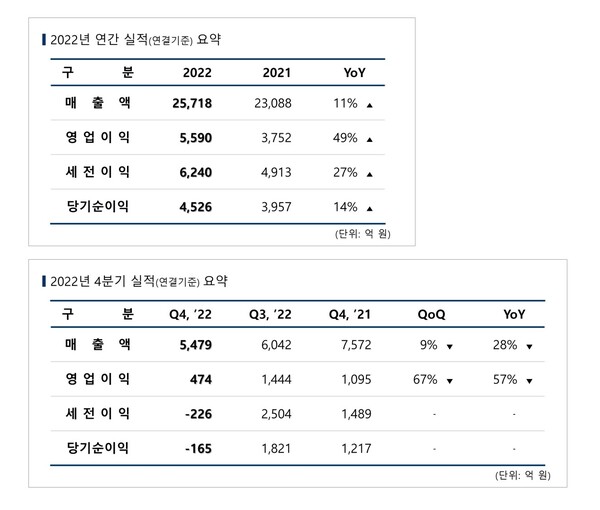 2022년 엔씨소프트 연간 실적은 매출 2조5718억 원, 영업이익 5590억 원, 당기순이익 4526억 원이다. 역대 최대 연간 매출로 전년 대비 11% 증가했다. 영업이익과 당기순이익은 2021년보다 각각 49%, 14% 상승했다.