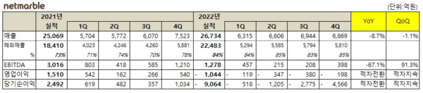 넷마블은 2022년 매출 2조6734억 원을 달성했다. 이는 전년 대비 6.6% 상승한 수치다. 영업 손실은 1044억 원으로 적자전환했다.