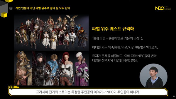스토리는 게임의 정체성인 '전쟁'이 키워드다. 최후의 인간 국가 '프라시아 왕국'의 이야기를 담았다. 엘프와의 투쟁의 역사, 다양한 인물 간의 정치 관계가 핵심이다. 라이트 유저를 위한 것 뿐만 아니라 '월드 오브 워크래프트', '파이널판타지' 등 인기 MMORPG 힘의 근간이 스토리인 만큼 심혈을 기울인 것으로 보인다.