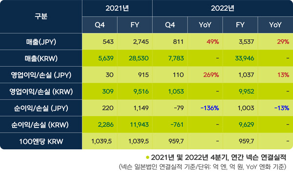 2022년 4분기 매출은 1년 전보다 49%나 늘어난 811억 엔을 올렸다. 영업이익은 전년 동기 대비 269%나 증가한 110억 엔이다. 반면 순이익은 달러 예금 자산의 외화환산손실로 79억 엔 적자를 기록했다.