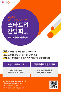 오렌지플래닛 창업재단(센터장 서상봉, 이하 ‘오렌지플래닛’)은 27일 전주센터에서 ‘초기 고객사 마케팅 전략’을 주제로 2023년 ‘스타트업 간담회’ 1회차를 개최한다.
