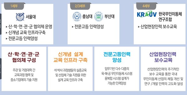 -서울대 주관으로 13개 대학, 연구소 3개소, 산업체 및 관-군 협력 무인이동체 전문인력 양성과 연구개발 능력 향상