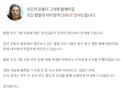 카카오게임즈는 1일 0시 10분 신속하게 관련 공지를 올렸다. 카카오게임즈는 "일부 유튜브 방송에서 확인된 불법 프로그램의 경우 영구 계정 제재 대상이다. 현재 내부에서 면밀하게 확인하고 있다. 불법 프로그램 사용 여부 등에 대해선 최대한 정확하고 신속하게 조사를 진행하겠다. 게임 이용에 불편을 드려 죄송하다. 조사 결과는 추후 공지를 통해 상세하게 안내하겠다"고 전했다.