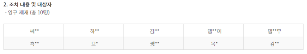 불법 프로그램 사용자 제재 내역도 공개했다. 공지에 따르면 총 10명의 유저가 불법 프로그램 사용으로 영구 정지 처분이 이뤄졌다. 제재 명단에는 핵 프로그램 제보 영상에서 발견된 하** 유저도 포함되어 있었다.