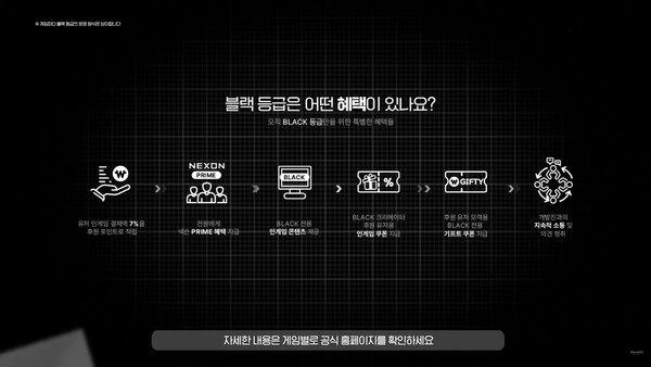 BLACK 등급은 상위 3명만 달성할 수 있다. BLACK 등급 크리에이터는 수익 배분 비율 7%와 각 게임 특별 프리미엄 혜택을 제공받는다. 넥슨 설명에 따르면 BLACK 등급 달성 크리에이터 전원에게는 넥슨 프라임 혜택 지급, BLACK 전용 인게임 콘텐츠 제공, BLACK 크리에이터 후원 유저용 인게임 쿠폰 지급, 후원 유저 모객용 BLACK 전용 기프티콘 지급, 개발진과 지속적인 소통 및 의견 청취 등 다양한 혜택이 제시됐다.