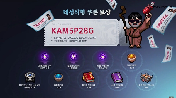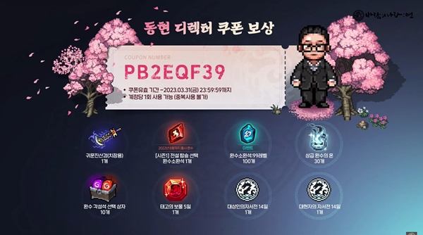 업데이트 발표 전 바람의나라: 연 개발을 맡았던 이태성 전 디렉터도 유저들과 인사했다. 이 전 디렉터는 "쇼케이스에 참여할 생각이 없었는데 이렇게 인사드릴 수 있게 되어 기쁘다. 이왕 나왔으니 쿠폰을 준비했다. 보물 탑승 환수 3개, 변신 환수 소환석 1개, 수화 환수 소환석 2개 등 다양한 보상이 담겨 있다. 번호는 KAM5P28G다. 앞으로도 유저들에게 좋은 게임이 될 수 있길 멀리서 응원하겠다"고 전했다.