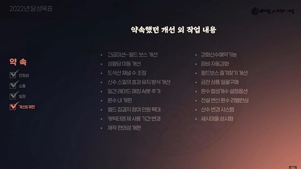 2022년 4분기 바람의나라: 연은 라이브 소통, 개발자 서신, 공지로 개발 의도를 충실히 전달하고자 노력했다. 태고의 보물, 환수 성장 시스템, 심연의 문 개편으로 콘텐츠 접근성을 향상시키고 스펙 다변화를 이끌어냈다.