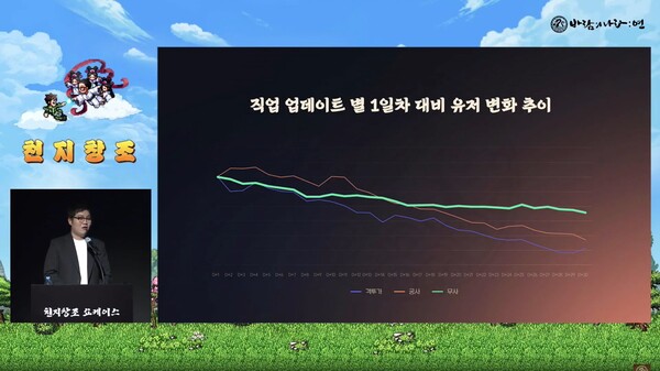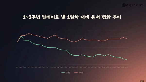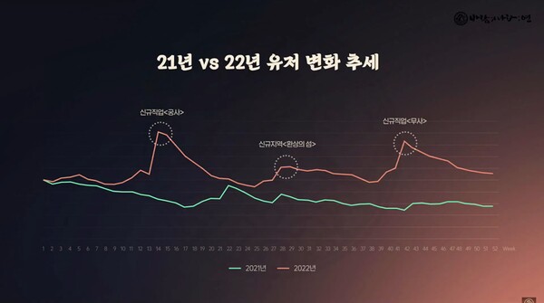 김 디렉터 평가는 지표에서 그대로 드러났다. 2022년 접속자 변동 추이 그래프에서는 4월 궁사, 10월 무사 업데이트로 신규 유저 유입이 크게 증가했다. 특히 무사 업데이트 이후에는 유입률과 함께 잔존율도 안정세를 보였다.