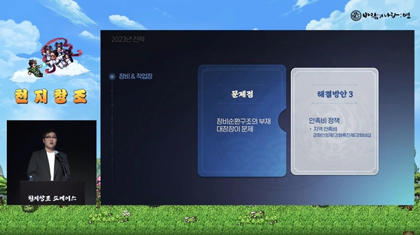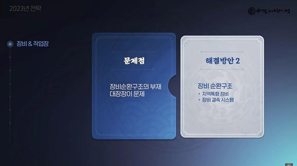 김 디렉터 설명에 따르면 장비 순환 구조와 작업장 캐릭터는 4월 지옥 업데이트부터 시행되는 새로운 장비 정책을 토대로 지역 특화 장비 도입, 장비 결속 시스템 개선, 지역 강화안정제·강화촉진제·강화비급 도인 등으로 해소할 계획이다.