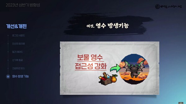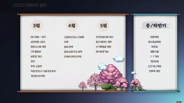 또한 1대1 거래, 개인 상점, 랭크 시스템, 버프창, 긴급미션 난도 및 보상 상향, 진선의 호리병 보상 획득 방식 변경, 일간 레이드 리뉴얼, 신기루 동굴 재정비, 영수 방생 기능 추가 등 3월부터 5월까지 이뤄질 개선안도 주목 포인트다.