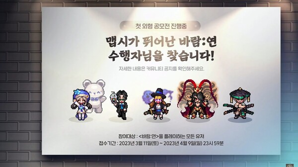 바람의나라: 연은 오는 4월 9일까지 외형 공모전 '의복 곤태수투'를 실시한다. 양식에 맞춰 무기, 방패, 갑옷, 투구, 망토 1세트 외형을 디자인해 설명과 같이 체출하면 참여할 수 있다. 수상자에게는 상금 및 경품 그리고 게임 내 칭호와 직접 디자인한 외형 세트가 지급된다.