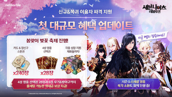 넷마블은 봄맞이 기념 신규/복귀 이용자를 위한 대규모 정착 지원 이벤트를 실시한다. 먼저 신규/복귀 이용자를 대상으로 일일 미션 완료 시 4성 영웅 선택권(28장), 스페셜 I 4성 영웅 선택권(2장), 루비 등 풍성한 보상을 지급하는 카니발 이벤트를 진행한다.