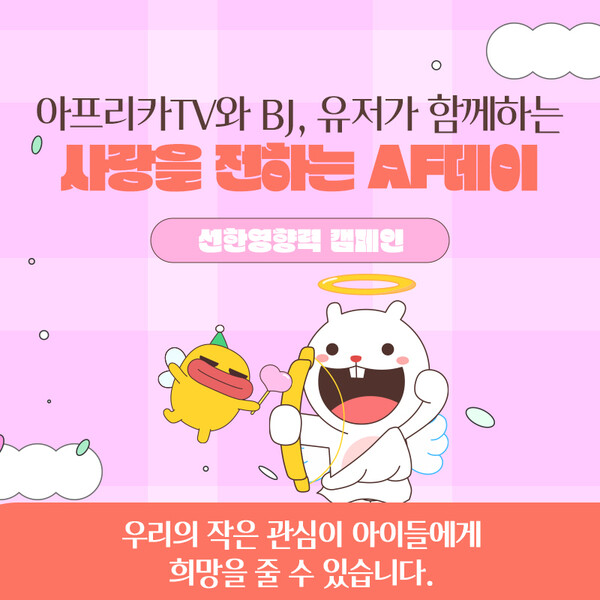 아프리카TV는 2021년부터 온∙오프라인을 통해 실종아동찾기, 결식 아동에게 생필품을 전달하는 활동을 진행 등 ‘선한영향력 캠페인’을 통해 다양한 형태로 사회공헌활동을 이어가고 있다. 앞으로도 아프리카TV는 BJ들이 참여할 수 있는 사회공헌활동 캠페인을 정기적으로 진행할 예정이다.