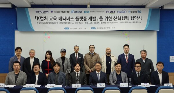 7일 오전 11시 숭실대학교 전산관 1층 다솜홀에서 업무협약을 체결한 기업들은 숭실대학교 글로벌미래교육원과 협력하여 올해 하반기 해외 대학 및 교육기관의 학생들을 대상으로 메타버스 플랫폼에서 한국어와 함께 한국문화교육을 시행한다는 계획이다.