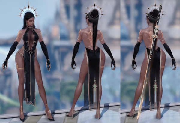 직선 형태의 금속 장식과 타투를 통해 간결하게 표현된 황금 길이 눈에 띈다. 볼다이크의 대현자 세헤라데와 같이 앞과 뒤를 가리고 옆을 시원하게 개방한 디자인이 매력적이다.