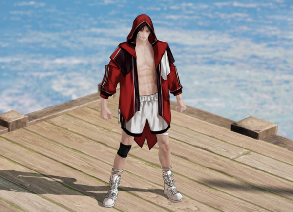 스포티한 트레이닝 반바지 위에 오버핏 복싱 가운을 걸쳐 챔피언다운 느낌을 살렸다. 포인트는 신발로, 발목 위까지 잡아주는 운동화 디테일에 심혈을 기울였다.