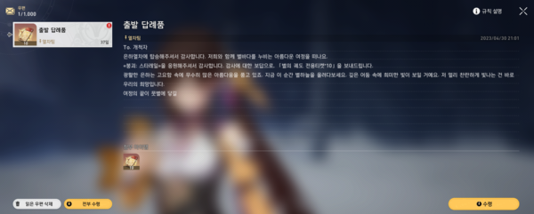 호요버스 측은 "4월 30일 오후 9시 이후 개척 레벨 10 이상 달성 유저들에게 '출발 답례품'을 지급했다. 우편은 6월 7일 오전 7시까지 보관된다. 꼭 잊지 말고 수령하길 바란다"고 전했다.