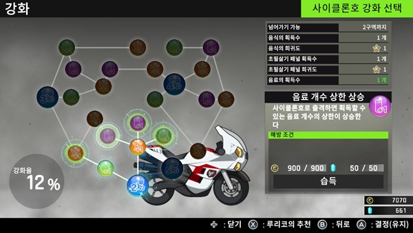 플레이를 통해 얻은 코인과 스킬 포인트로 가면라이더와 ‘사이클론호’를 강화할 수 있다. 가면라이더는 공격이 강력해지거나, 회피 시간이 길어지는 등 전투에 직접적인 요소를 강화한다. 사이클론호 강화는 스테이지를 뛰어넘거나 획득할 수 있는 음식 개수 제한을 늘리는 방식이다.