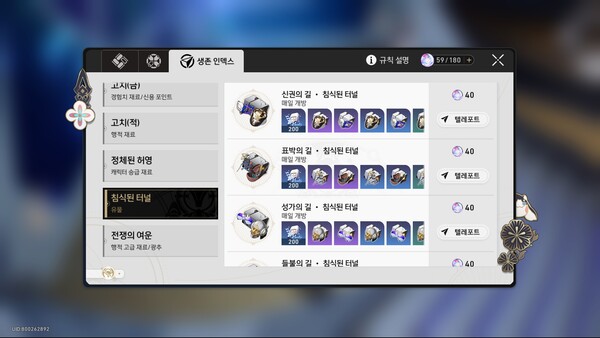 고치 종류를 보며 어떤 것을 해야 할 지 고민하는 유저가 많다. 고치 선택 방법은 간단하다. 일일 미션에 포함된 고치 혹은 캐릭터를 성장시킬 때 부족한 캐릭터 승급, 광추 승급, 행적 강화 재료가 드랍되는 고치를 선택하면 된다. 고치를 진행하기 위해선 개척력이 필요하다. 고치를 진행할 때마다 마일리지가 적립되지만 개척력을 무작정 고치에만 사용하면 주 제한 콘텐츠를 즐길 수 없으므로 계산하면서 사용하자.