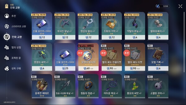 잔화는 마일리지 개념이다. 교환 물품은 1개월 단위로 갱신된다. 우선적으로 교환할 아이템은 별의 궤도 전용티켓, 별의 궤도 티켓, 운명의 발자취다. 3가지를 확보했다면 캐릭터 성장에 필요한 재료를 자유롭게 교환해도 무관하다.