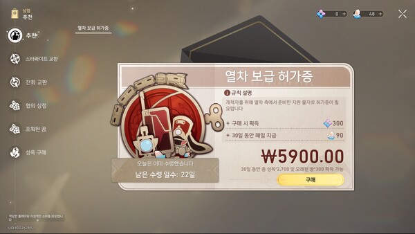 과금을 하겠다면 월정액 상품인 '열차 보관 허가증'을 추천한다. 배틀패스인 '무명객의 영광'도 나쁘지 않지만 꼭 구매할 필요는 없다. 추가 과금을 고민한다면 오래된 꿈 초회 2배 보너스 외엔 고민할 게 없다.