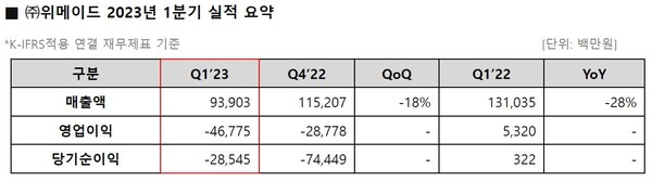 위메이드(대표 장현국)가 매출 939억 원, 영업손실 468억 원, 당기순손실 285억 원을 뼈대로 하는 2023년 1분기 실적을 9일 발표했다.
