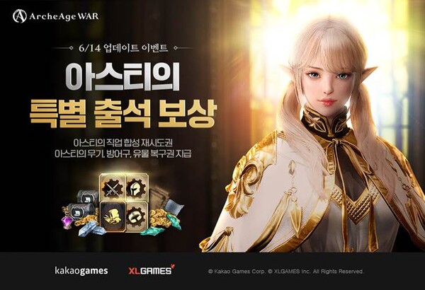 ‘아키에이지 워’ 서비스 100일을 기념하는 ‘아스티 특별 출석 이벤트’도 함께 시작됐다. 6월 14일부터 7월 5일까지 이벤트 기간 중 14일간 출석하면 무기, 방어구, 유물 복구권 및 직업 합성 재시도권을 모두 받는다.