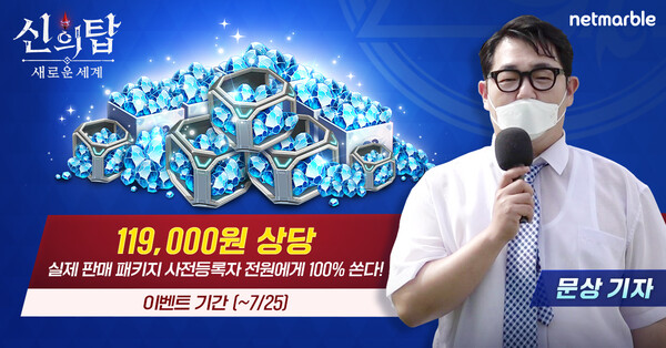 넷마블은 이번 영상을 통해 오는 25일까지 신의 탑: 새로운 세계 사전등록에 참여한 모든 이용자에게 11만 9000원 상당의 실제 판매 패키지를 무료로 증정키로 했다. 이 혜택은 신의 탑: 새로운 세계 브랜드 사이트를 통해 사전 등록에 참여한 경우만 제공된다.