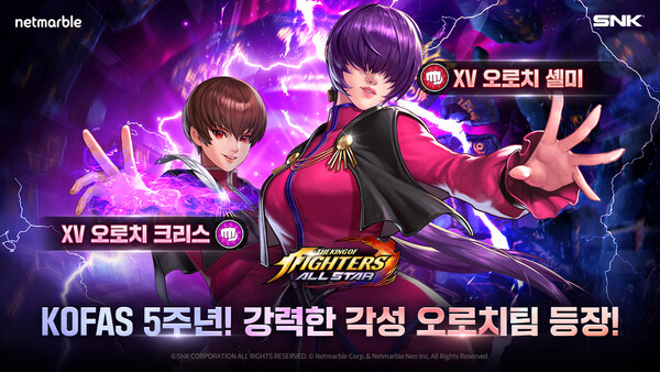 넷마블(대표 권영식, 도기욱)은 액션 RPG ‘더 킹 오브 파이터즈 올스타’ 5주년을 기념해 EX등급 ‘XV 오로치 셸미’와 ‘XV 오로치 크리스’를 추가하는 등 다양한 업데이트를 실시했다.