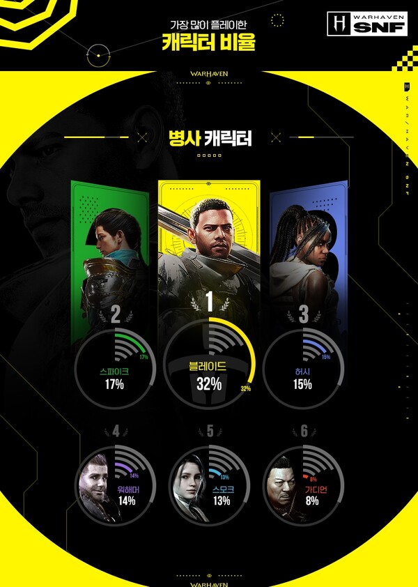 스팀 넥스트 페스트에서 이용자들이 가장 많이 즐긴 병사는 '블레이드'였다. 전체 데이터에서 블레이드 32%, 스파이커 17%, 허시 15%로 각각 1~3위를 차지했다. 그 뒤를 워해머 14%, 스모크 13%, 가디언 8%가 이었다.