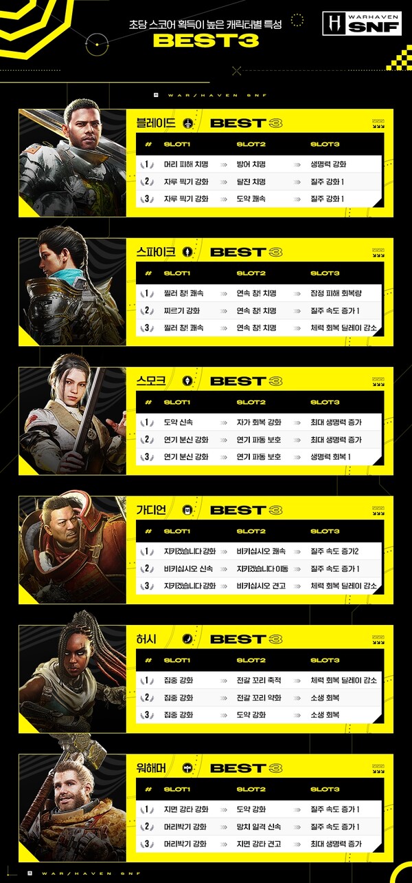 이후 초당 스코어 획득이 높은 캐릭터별 특성 순위를 공개했다. 블레이드의 경우 머리 피해 치명, 방어 치명, 생명력 강화 빌드가 1위로 집계됐다. 2위는 자루 찍기 강화, 탈진 치명, 질주 강화1이다. 같은 캐릭터라도 이용자 취향에 따라 다양하게 사용됐다는 사실을 알 수 있다. 물론 허시와 같이 큰 차이가 나지 않는 캐릭터도 있다.