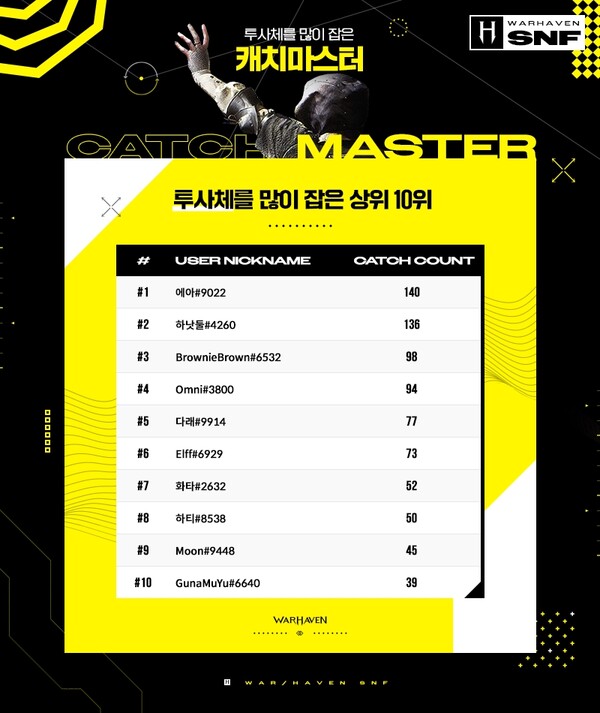 스팀 넥스트 페스트 당시 특별한 기록도 일부 공개했다. 투사체를 많이 잡은 캐치 마스터 순위에는 '에아', '하낫둘', 'Brownie', 'Omni', '다래' 유저가 톱5에 이름을 올렸다. 이들은 연기 벽으로 대포알 등의 투사체를 자주 잡았다. 숙련도가 필요한 플레이인데 1일차부터 사용해 개발진도 감탄을 표했다.