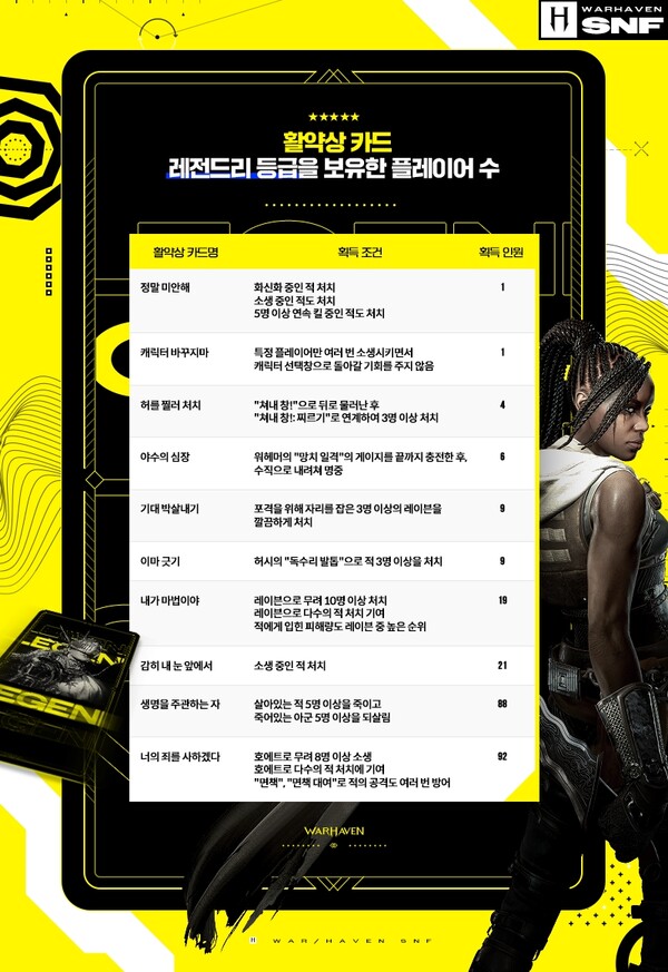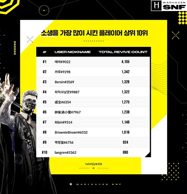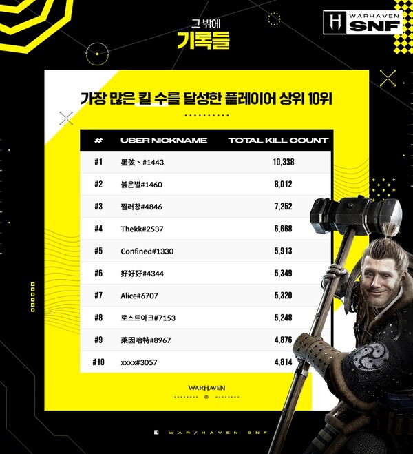 이외에도 가장 많은 킬 수를 달성한 유저, 소생을 가장 많이 사용한 유저, 희귀한 레전드리 등급 활약상 카드를 달성한 유저 등 다양한 랭킹이 눈길을 끌었다.